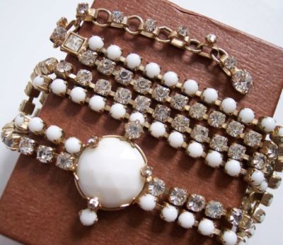 Vintage Necklace DENBE Milk Glass Rhinestone Clear Chok
