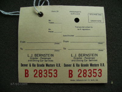 DENVER & RIO GRANDE WESTERN RAILROAD BAGGAGE TAG