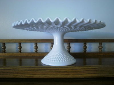 Fenton milk glass hobnail cake stand 12.5 inches wide.