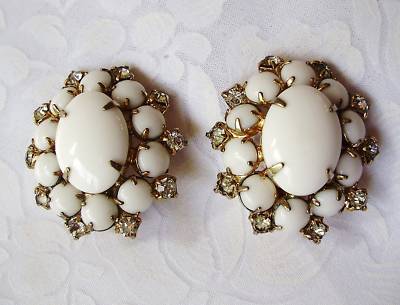 VINTAGE WHITE MILK GLASS & RHINESTONE CLIP EARRINGS
