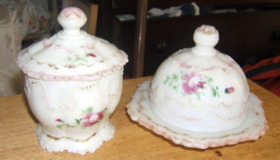 ANTIQUE VICTORIAN HAND PAINTED MILK GLASS CHEESE DISH +