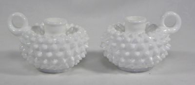 2 Fenton Milk Glass 1953 Handled HOBNAIL Candleholders
