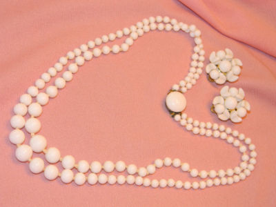 Vintage Retro 2 Strand Milk Glass Bead Necklace Earring
