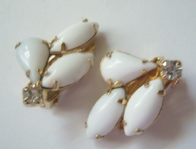 VINTAGE ESTATE MILK GLASS RHINESTONE CLIP EARRINGS