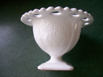 Sm Milk Glass pedestal compote, open work rim. Floral