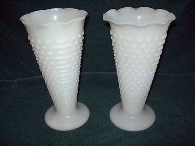 2 White Milk Glass 9 1/2" Tall Hobnail Vases-Vintage