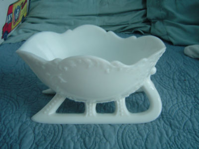 Title (ebay affiliate link): VINTAGE MILK GLASS CHRISTMAS SLEIGH BOWL, HOLIDAY!!