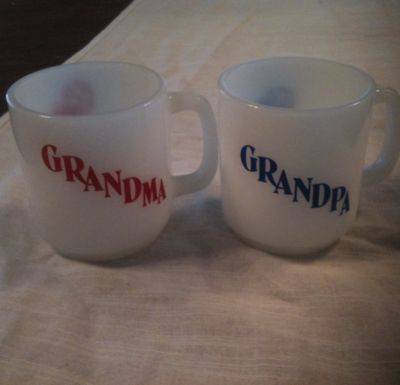 2 Grandma/Grandpa GLASBAKE MUGS MILK GLASS-vintage