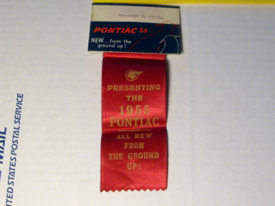 Title (ebay affiliate link): 1955 PONTIAC NAME TAG & RIBBON FROM DETROIT CAR SHOW