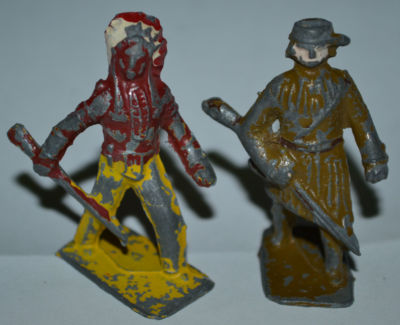 Two Lead Toy Lincoln Logs Figures Indian + Frontiersman