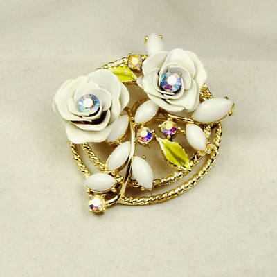 Vintage Corocraft Pin with AB Rhinestones, Milk Glass