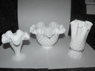 3 Milk Glass Hobnail Fenton Dish /Vases Handkerchief