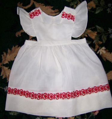 Title (ebay affiliate link): VINTAGE TODDLERS PINAFORE ANTIQUE WHITE RED INSERT LACE