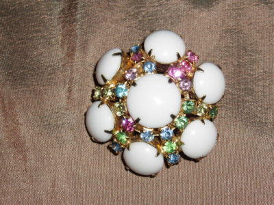 Juliana ? Milk Glass Rhinestone Brooch Pin Vintage GT