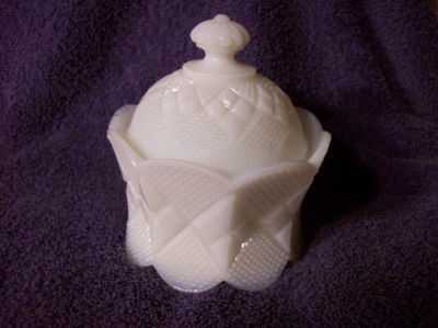 VINTAGE WHITE MILK GLASS DIAMOND POINT BOWL W/LID