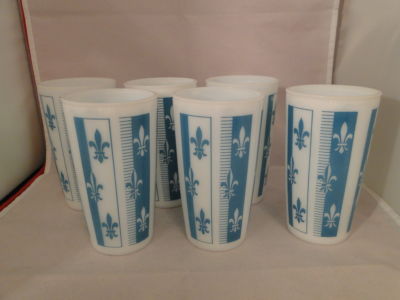 6 Hazel Atlas Blue Fleur de Lis Milk Glass Tumblers