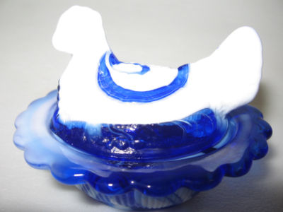 COBALT MILK SLAG GLASS HEN CHICKEN ON NEST BASKET DISH