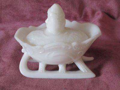 Vintage Milk Glass Santa in Sleigh Sled Covered Dish