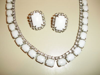 Pretty Vintage Milk Glass Rhinestone Necklace & Earring