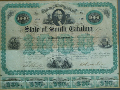 Title (ebay affiliate link): STATE OF SOUTH CAROLINA $1000 RECONSTRUCTION BOND 1869