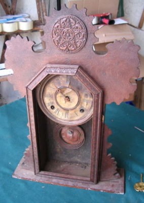 Title (ebay affiliate link): Antique Gingerbread USA Key Wind Shelf Clock For Parts