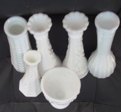 6 milkglass vases, Brody Hoosier Avon etc, L@@K PHOTOS