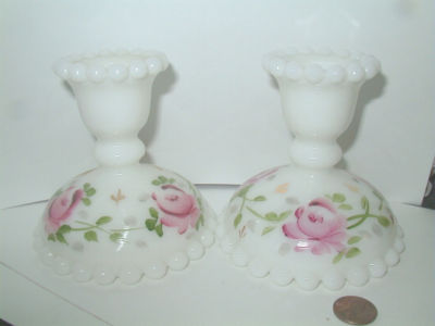 PR CONSOLIDATED MILK GLASS HP PINK FLOWER CANDLESTICKS