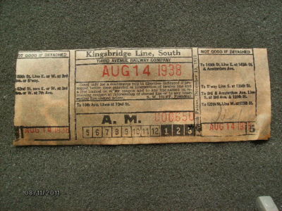 THIRD AVENUE RAILWAY CO KINGSBRIDGE LINE 1938 TICKET