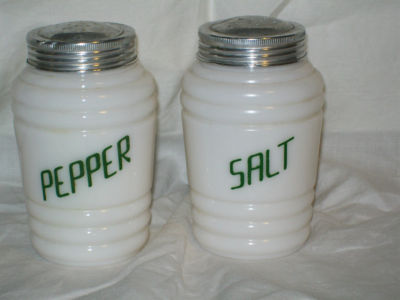 Milk Glass Green Print Salt and Pepper Shakers Vintage