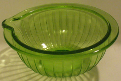 GREEN DEPRESSION GLASS MIXING BOWL W/SPOUT