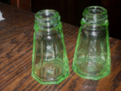 HA Green Vaseline Depression Glass Paneled Shakers
