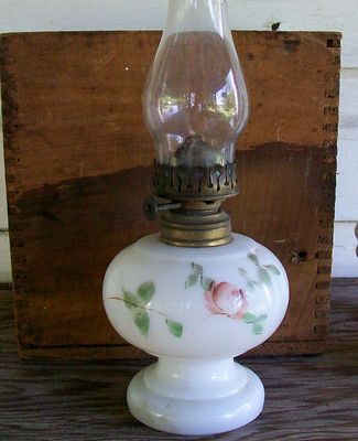 Antique Vtg Miniature Milk Glass Rose Oil Kerosene Lamp