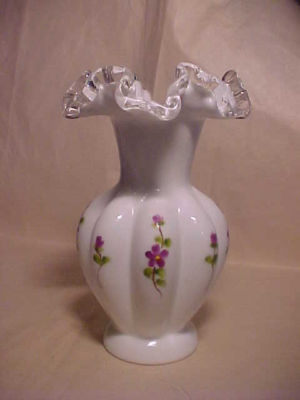 6" Fenton Milk Glass Violets In The Snow Melon Rib Vase