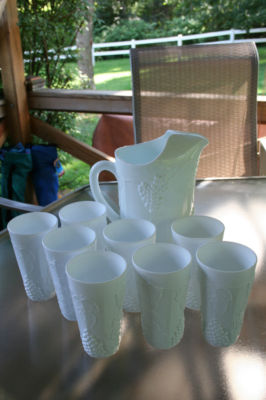 Estate Milk Glass-Indiana Glass-Grape-Pitcher&8Tumblers