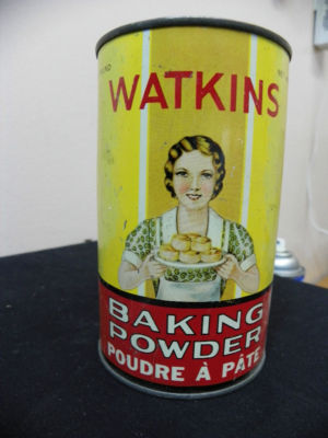 vintage graphic WATKINS BAKING POWDER antique tin.