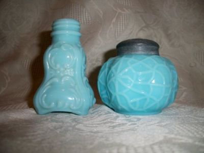 Blue Milk Glass Shakers by Dithridge Glass Co.