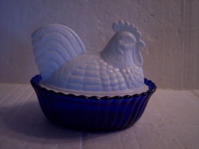 Cobalt, Milk Glass Westmoreland Hen on Nest Master Salt