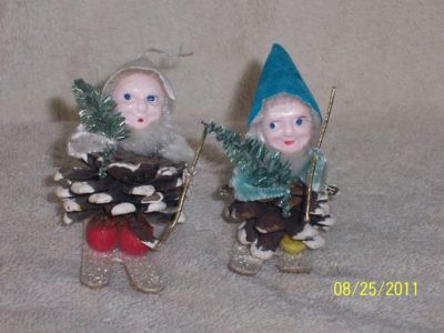 Title (ebay affiliate link): ~2~VTG~PINECONE~ELVES~DWARVE~GNOME~SKIING~XMAS ORNAMENT