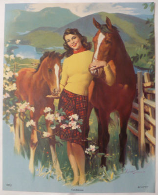 Vtg Calendar Print 40's Lady w/ Horses Equestrian