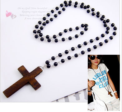 antique long wooden cross natural beads necklace