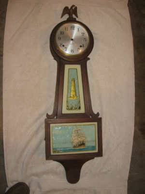 SESSIONS BANJO CLOCK, REVERSE PAINTED, WINDUP, EARLY