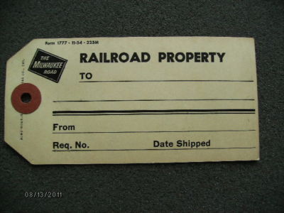 THE MILWAUKEE ROAD RAILROAD PROPERTY TAG CIRCA 1954