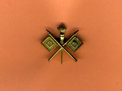 ANTIQUE PIN WITH TWO FLAGS AND TORCH