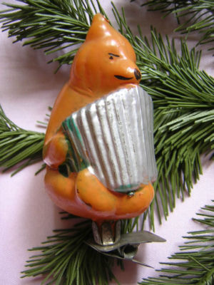 RUSSIAN GLASS XMAS ORNAMENT BEAR WITH ACCORDION