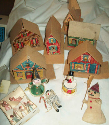 Vintage Christmas Pinecone Elf Gnome Dwarf Ornaments & Cardboard Houses & Angels