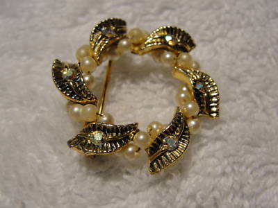 Title (ebay affiliate link): VINTAGE RHINESTONE & PEARL ANTIQUE GOLDTONE CIRCLE PIN