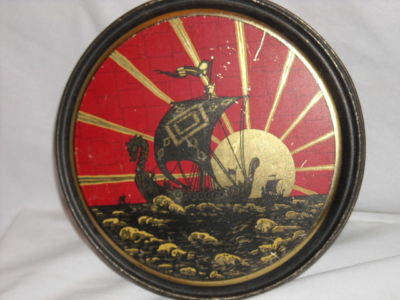 Title (ebay affiliate link): VINTAGE CANCO Round Candy TIN Queen Anne Co. HAMMOND IND Art Deco VIKING SHIP