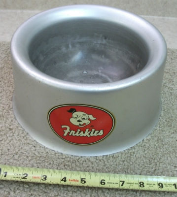 Title (ebay affiliate link): RARE VINTAGE LARGE FRISKIES DOG FOOD WATER BOWL REYNOLDS ALUMINUM WATERLOO IOWA