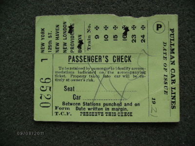PULLMAN CAR LINES RAILROAD 1921 PASSENGER CHECK
