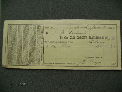 OLD COLONY RAILROAD 1890 FRIGHT RECEIPT SANDWICH MA